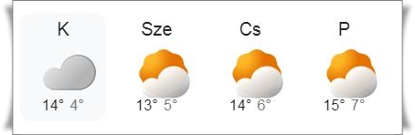 Szerdán egyre nagyobb területen szakadozik a felhőzet, majd a napközben képződő gomolyfelhők mellett általában több órára kisüt a nap. Néhol - főként északnyugaton - gyenge eső, zápor előfordulhat. A légmozgás nagyrészt mérsékelt marad. A legmagasabb nappali hőmérséklet 12 és 17 fok között alakul. Késő estére 5 és 12 fok közé hűl le a levegő. Ma nincs fronthatás. A hideg reggelek miatt érdemes meleg sapkát, sálat is felvenni, kerüljük továbbá a huzatos, nedves környezet. Meleg italokkal, levesekkel tartsuk magunkat melegen.